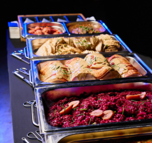 In de koude dagen gebruik je meer energie om je lichaam warm te houden. Dit houdt ook in dat je lichaam meer eten nodig heeft. Dat komt goed uit want ons herfst/winter buffet zit vol met heerlijke gerechten. Zo bestaat ons buffet uit smakelijke vleesgerechten, zoals een smakelijk stoofpotje van wild en kalkoenrollade met truffelsaus en bospaddenstoelen. En wat dacht je van ons heerlijk pompoenstoofpotje met kikkererwten en tomaat? Het ultieme comfortfood èn veganistisch. Naast de warme gerechten bieden we ook mooie salades en groentegerechten. Zo bevat dit buffet een salade van geroosterde bieten en noten. Daarnaast vind je in dit herfst/winter buffet een uitgebreide aardappelsalade met spek en bosuitjes terug. Tot slot wordt dit buffet afgemaakt met bijgerechten zoals: